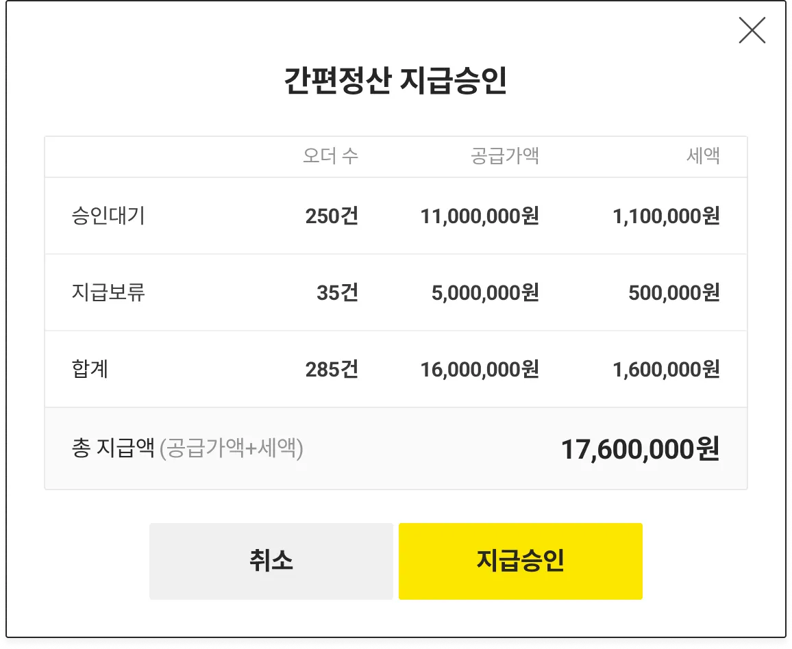 간편정산 지급승인 팝업에서 오더의 금액을 확인하고 [지급승인] 버튼을 클릭 하시면, 지급승인이 진행됩니다.