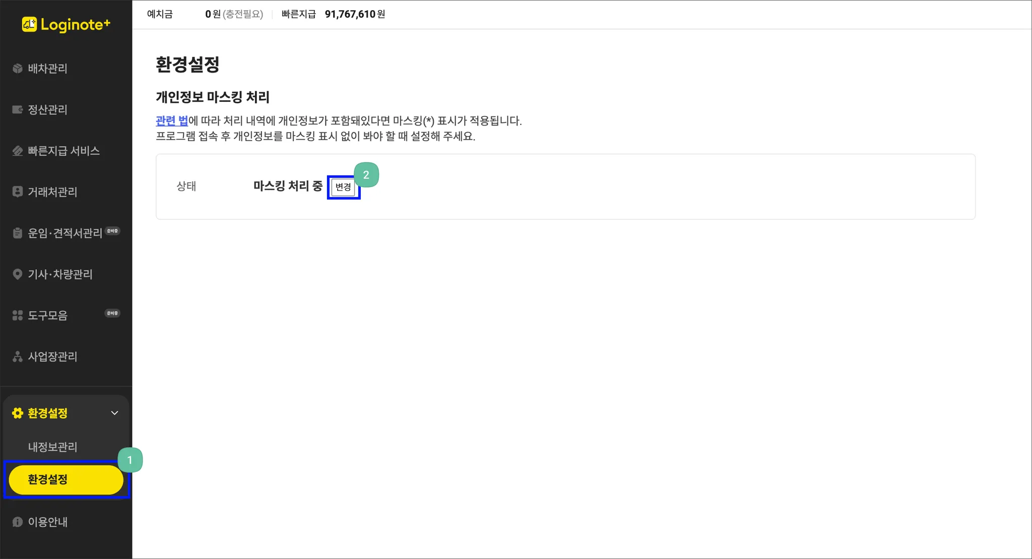 환경설정 페이지의 개인정보 마스킹 처리에서 [변경] 버튼을 클릭해 주세요.