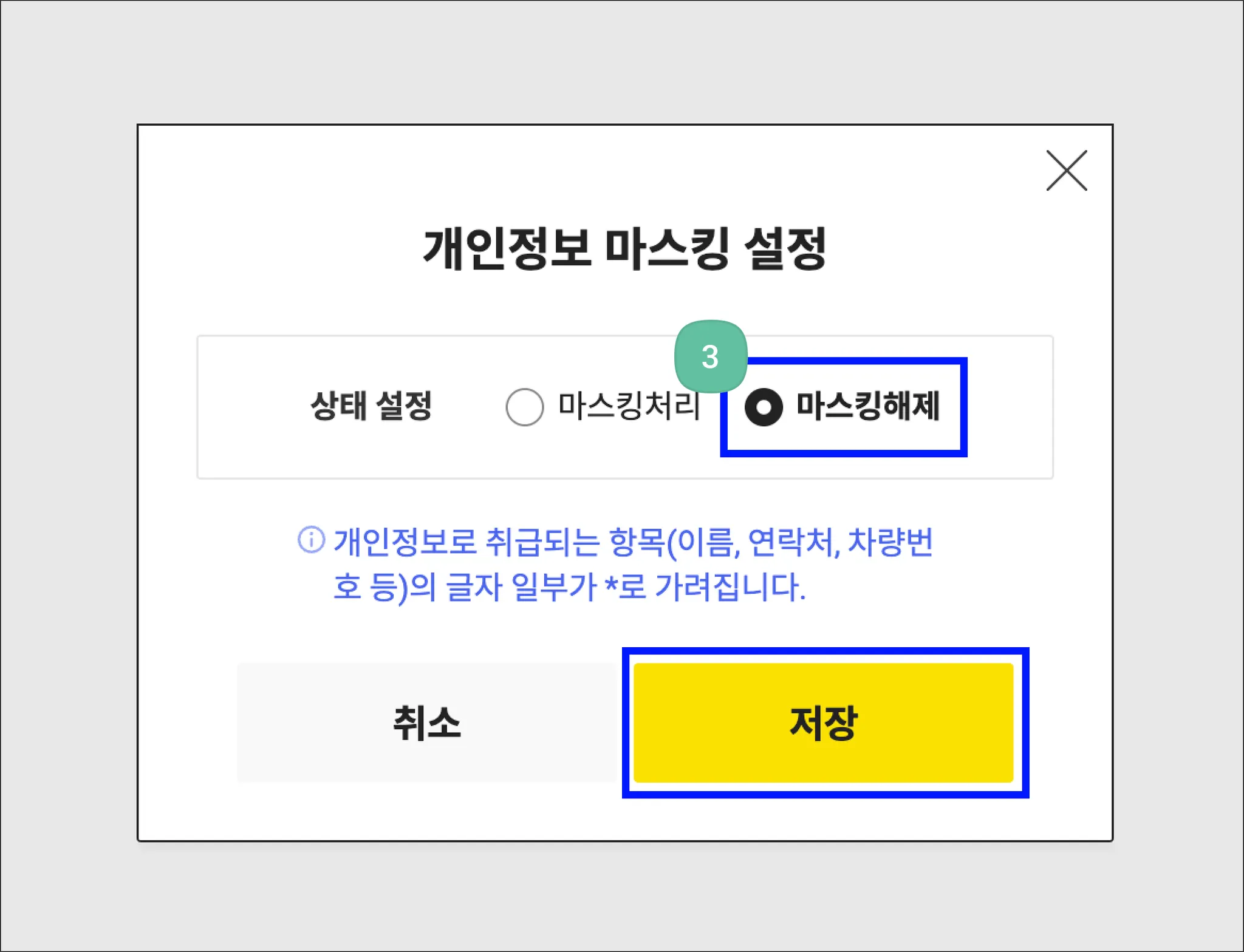 개인정보 마스킹 설정 화면에서 [마스킹해제]를 선택하신 후, [저장] 버튼을 클릭해 주세요.